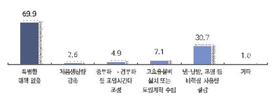 그러나 전기요금 인상 대응 계획(복수응답)에 대해서는 특별한 대책이 없다는 답변이 69.9%로 가장 많았다. 이어 냉·난방, 조명 등 비핵심 사용량 절감(30.7%), 고효율 설비 설치 또는 도입 계획 수립(7.1%) 등 순이었다.