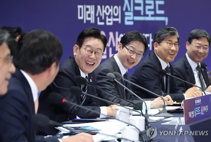 | 이재명 대통령이 23일 울산전시컨벤션센터에서 열린 '울산의 마음을 듣다' 타운홀미팅 간담회에서 김정관 산업부 장관의 보고를 들으며 웃고 있다. (사진=연합뉴스) |