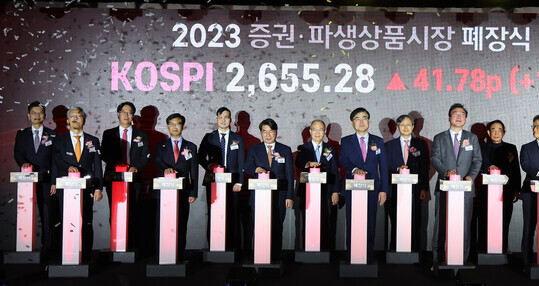 | 28일 오후 부산 남구 부산국제금융센터에서 열린 2023년 증권·파생식품 시장 폐장식에서 손병두 한국거래소 이사장을 비롯한 참석자들이 폐장을 알리는 버튼을 누르고 있다. 코스피는 올해 마지막 거래일인 28일 1.6% 상승해 2천655.28로 마무리했다. (사진=연합뉴스) |