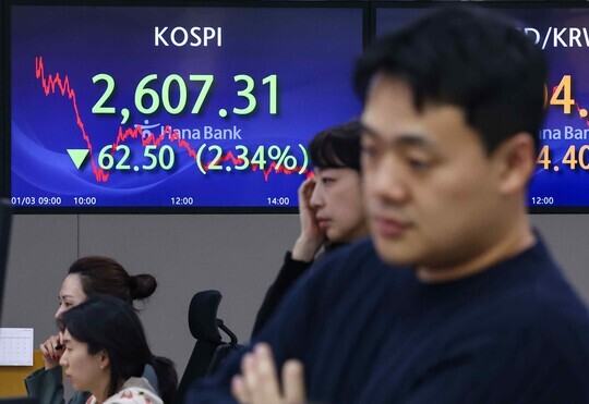 | 3일 오후 서울 중구 하나은행 본점 딜링룸 현황판에 코스피가 표시돼 있다. 이날 코스피는 전장보다 62.50p(2.34%) 내린 2,607.31로 장을 마쳤다. (사진=연합뉴스) |