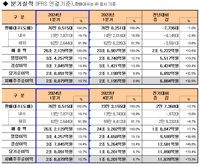 1분기 영업이익은 판매 감소와 인센티브 등 비용 증가에도 불구하고 ▲고수익 RV 차종 중심의 판매 믹스 개선 및 가격 상승 효과 ▲원자재 가격 하향 안정화 ▲원화 약세에 따른 우호적 환율 효과 등에 힘입어 전년 동기 대비 19.2% 증가한 3조 4257억원을 기록하면서 분기 기준 최대 영업이익을 기록했다.