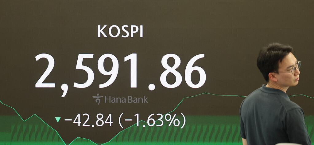 코스피 지수가 전 거래일 대비 1.63% 내린 2591.86에 거래를 마쳤다. 이스라엘의 이란 재보복 소식이 전해지며 장중 2553.55까지 급락했던 코스피는 낙폭을 일부 축소한 채 하락 마감했다.
