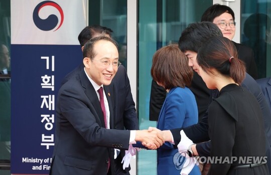 | 추경호 경제부총리 겸 기획재정부 장관(왼쪽)이 9일 오전 정부세종청사 중앙동 신청사에서 입주 기념 현판식을 마친 뒤 직원들과 인사하고 있다. (사진=연합뉴스) |
