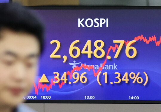 코스피 지수가 전 거래일 대비 34.96포인트(1.34%) 오른 2648.76에 거래를 마쳤다. 이날 21.83포인트 상승 출발한 지수는 외국인과 기관의 동반 매수에 힘입어 장 중 내내 오름세를 유지했다.