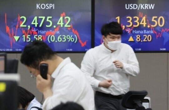 12일 코스피 지수가 외국인과 기관의 동반 매도세에 하락 마감하며 2740선으로 밀렸다. 코스피 지수는 전 거래일 대비 15.58포인트(0.63%) 하락한 2475.42로 장을 마쳤다. 미국의 부채 한도 협상 불확실성과 경기 침체 우려에 투자심리가 위축된 영향으로 풀이된다.