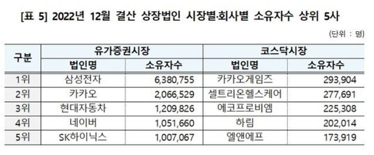 | 2022년 12월 결산 상장법인 시장별 및 회사별 소유자수 상위 5사. (사진=예탁결제원) |
