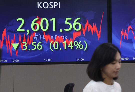코스피 지수가 전 거래일 대비 3.56포인트(0.14%) 내린 2601.56에 거래를 마치며 상승 하루 만에 하락 마감했다. 이날 유가증권 시장에서는 외국인이 2340억원, 기관이 938억원을 순매도하며 지수를 끌어내렸고 개인은 2645억원을 순매수했다.