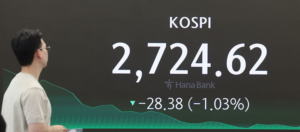 코스피 지수가 외국인의 대량 매도에 전 거래일 대비 28.38포인트(1.03%) 내린 2724.62에 거래를 마쳤다. 전날 상승분 이상을 반납하면서 지수는 3거래일 만에 2720선으로 다시 내려앉았다.