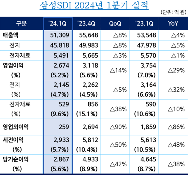 [알파경제=차혜영 기자] 삼성SDI가 올해 1분기 실적 발표하고, ▲매출 5조1309억원 ▲영업이익 2674억원을 기록했다고 30일 공시했다.