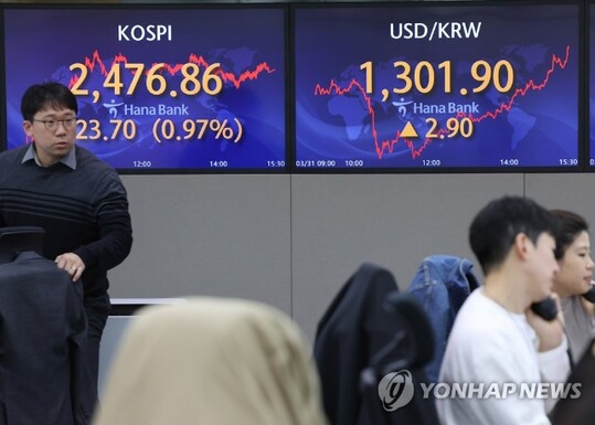 | 스피가 외국인과 기관 투자자의 매수세에 힘입어 1% 가까이 상승해 2,470대로 올라선 31일 오후 서울 중구 하나은행 본점 딜링룸에서 직원들이 업무를 보고 있다. (사진=연합뉴스) |