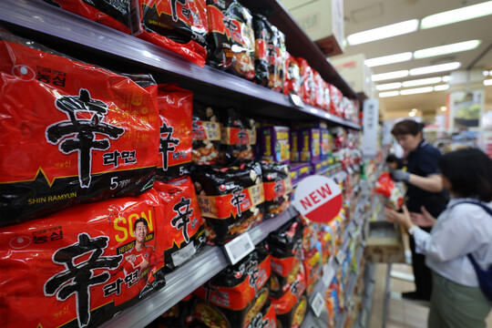 | 농심이 7월 1일부로 신라면과 새우깡의 출고가를 인하한다고 27일 밝혔다. 소매점 기준 1천원에 판매되는 신라면 한 봉지의 가격은 50원, 1천500원인 새우깡은 100원 각각 낮아질 것으로 예상된다. 이날 한 대형마트에 신라면이 진열돼 있다. (사진=연합뉴스) |