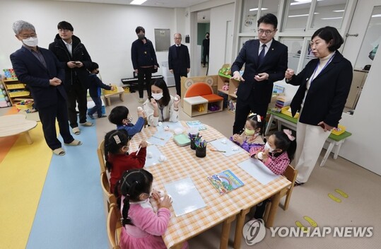 | 장상윤 교육부 차관이 2월 17일 유보통합(교육부·보건복지부로 나뉜 유아교육·보육 관리체계 통합) 추진을 위해 방문한 서울 용산구 청파유치원에서 수업을 참관하고 있다. (사진=연합뉴스 자료사진) |