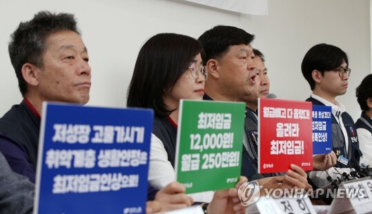 | 민주노총과 한국노총이 4일 중구 프란치스코 교육회관에서 2024년 적용 최저임금 기자회견을 하고 있다. 양대 노총은 시급 1만 2천원, 월급 250만 8천원(209시간 기준)을 요구했다. (사진=연합뉴스) |