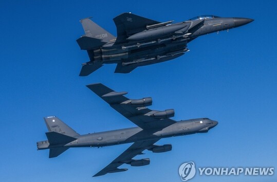 | 지난달 6일 미 전략폭격기 B-52H와 한국 F-15K, KF-16의 연합훈련 모습. (사진=연합뉴스) |