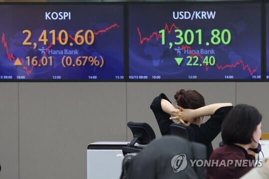 | 13일 오후 서울 중구 을지로 하나은행 딜링룸 모니터에 코스피와 원/달러 환율이 표시돼 있다. 미국 실리콘밸리은행(SVB) 파산 사태에도 이날 코스피는 전장보다 16.01포인트(0.67%) 오른 2 |