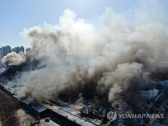 | 13일 오전 대전시 대덕구 목상동 한국타이어 공장에서 난 불로 인한 연기가 공중으로 치솟고 있다. (사진=연합뉴스) |