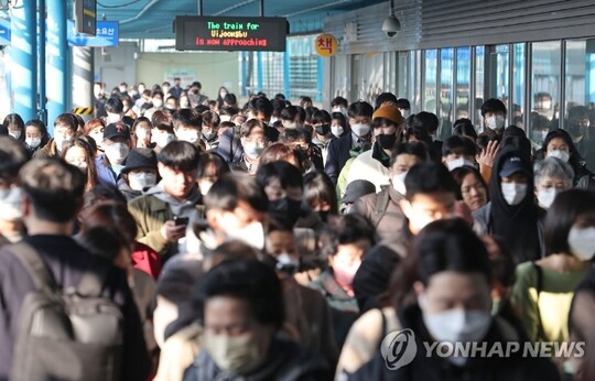 | 대중교통 마스크 착용 의무 해제 첫날인 20일 오전 서울 지하철 신도림역에서 시민 대부분이 마스크를 쓴 채 걸어가고 있다. (사진=연합뉴스) |
