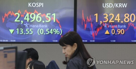 | 10일 서울 명동 하나은행 본점에서 직원들이 증시 및 환율을 모니터하고 있다. 코스피 지수가 2500선 밑으로 떨어져 있다. (사진=연합뉴스) |