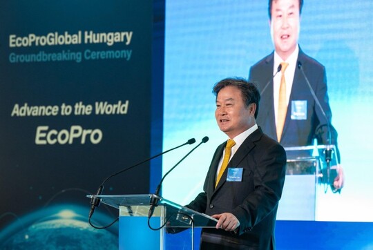 | 이동채 에코프로 회장이 지난 21일 헝가리 데브레첸에서 열린 '에코프로글로벌 헝가리 사업장' 착공식에 참석해 발언하고 있다. (사진=에코프로) |