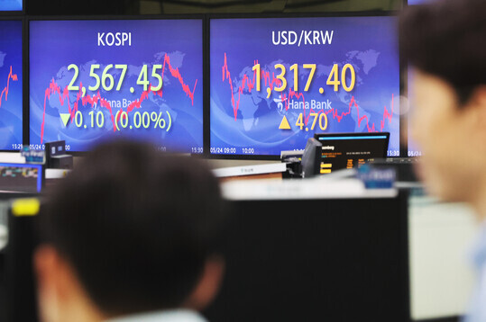 | 24일 서울 명동 하나은행 본점에서 직원들이 증시 및 환율을 모니터 하고 있다. 이날 코스피 종가는 전장보다 0.10포인트(0.00%) 내린 2 |