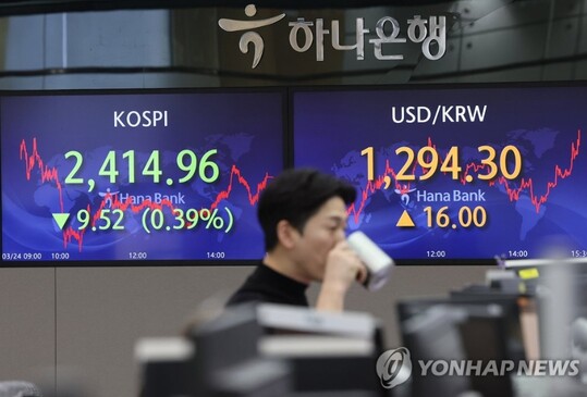 24일 코스피가 하락 마감했다. 미국의 지방 은행 리스크가 재차 부각되면서 위험자산 회피 심리가 커지고 안전자산 선호심리가 반영된 영향으로 풀이된다. 이날 코스피는 전날보다 3.21포인트 내린 2421.27로 출발한 뒤 장중 2400 밑으로 떨어지기도 했다. 오후 들어 하락폭이 줄면서 2400선을 회복했고 전 거래일 대비 9.25포인트(0.39%) 내린 2414.96으로 장을 마쳤다. 코스닥 지수는 전 거래일 대비 11.92포인트(1.47%) 오른 824.11로 마감했다. 코스닥은 820선에서 출발해 오전 10시경 810선으로 소폭 떨어졌지만 오후 들어 매수세가 힘을 받으며 820선을 재돌파하고 상승 마감했다.