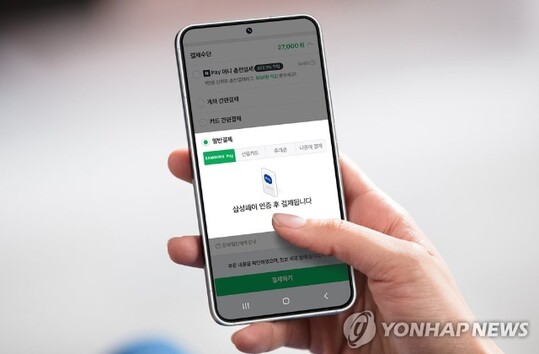 | 사진은 스마트폰에서 삼성페이를 통해 네이버페이 온라인 주문형 가맹점의 간편 결제를 이용하는 모습. (사진=연합뉴스) |