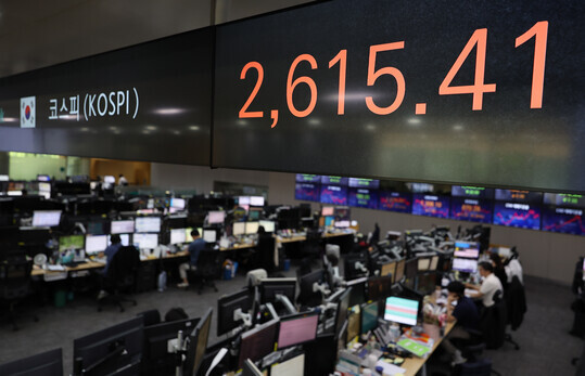 | 코스피가 0.5% 상승한 2,610대에서 장을 마감한 5일 오후 서울 중구 하나은행 본점 딜링룸에서 직원들이 업무를 보고 있다. 이날 코스피는 전장보다 14.05포인트(0.54%) 오른 2,615.41에 거래를 마쳤다. (사진=연합뉴스) |