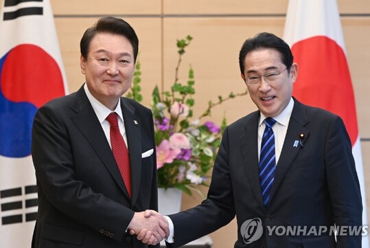 | 1박2일 일정으로 일본을 방문한 윤석열 대통령이 16일 오후 일본 도쿄 총리 관저에서 기시다 후미오 일본 총리와 한일 정상 소인수회담에 앞서 기념촬영을 하며 악수하고 있다. (사진=연합뉴스) |