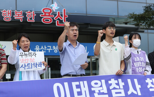 | 12일 오전 서울 용산구청 앞에서 10·29 이태원참사 유가족 협의회가 연 기자회견에서 참가자들이 박희영 용산구청장의 사퇴를 촉구하는 구호를 외치고 있다. (사진=연합뉴스) |