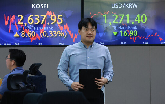 | 13일 오후 서울 중구 을지로 하나은행 본점 딜링룸 현황판에 코스피 |