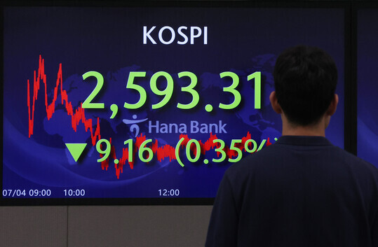 코스피가 외인과 기관의 매도세에 하루 만에 2600선 밑으로 떨어졌다. 2604.72로 상승 출발했던 코스피는 전 거래일 대비 0.35% 내린 2593.31에 장을 마쳤다. 이날 개인은 3044억원을 사들였고 기관과 외국인이 각각 2870억원, 594억원을 팔아치웠다.