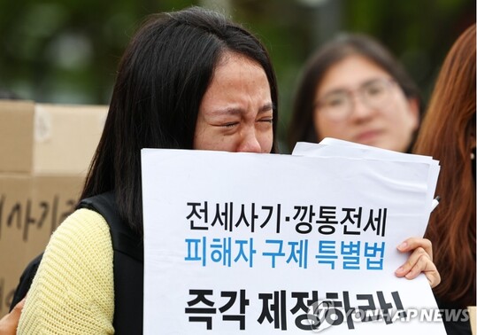 | 전세사기 피해자 백이슬씨가 20일 서울 용산구 대통령집무실 인근에서 열린 전세사기 대책 관련 대통령 면담 요청 기자회견에서 발언하며 울부짖고 있다. (사진=연합뉴스) |