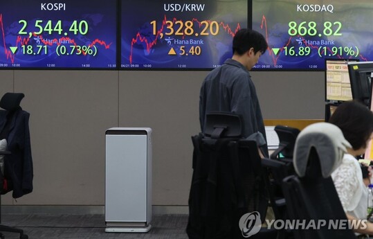 | 코스피가 전장보다 18.71p(0.73%) 내린 2,544.40로 마감한 21일 오후 서울 중구 하나은행 딜링룸에서 딜러들이 업무를 보고 있다. (사진=연합뉴스) |