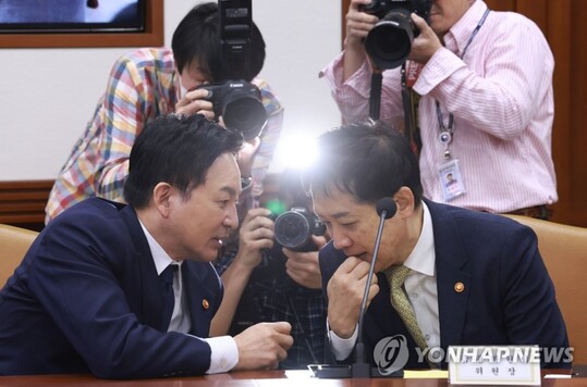 | 원희룡 국토교통부 장관(왼쪽)이 21일 정부서울청사에서 열린 비상경제장관회의 겸 수출투자대책회의에 참석해 김주현 금융위원장과 논의하고 있다. (사진=연합뉴스) |