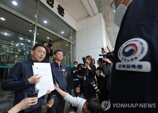 | 전국민주노동조합총연맹 관계자들이 21일 오전 고용노동부 직원들이 회계서류 비치·보존 여부가 확인되지 않은 노동조합에 대한 현장 조사를 위해 서울 중구 민주노총 사무실에 들어서려 하자 이를 거부하고 있다. (사진=연합뉴스) |