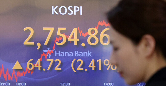 외국인과 기관 매수세 코스피 지수가 전 거래일 대비 64.72포인트(2.41%) 오른 2754.86에 장을 마감했다. 종가 기준 약 2년 만에 2750선을 넘어섰다.