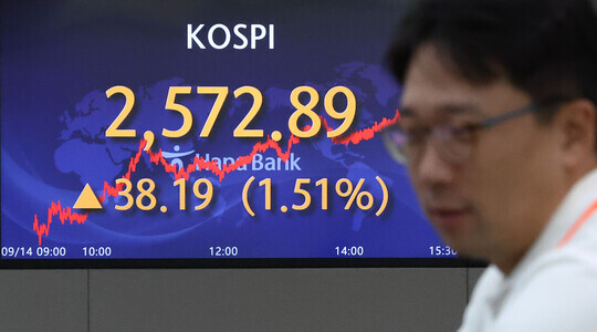 | 14일 오후 서울 중구 하나은행 딜링룸 전광판에 코스피 지수 등이 표시되고 있다. 이날 코스피 지수는 전 거래일 대비 38.19포인트(1.51%) 오른 2,572.89에, 코스닥은 16.75포인트(1.90%) 오른 899.47에 장을 마감했다. (사진=연합뉴스) |