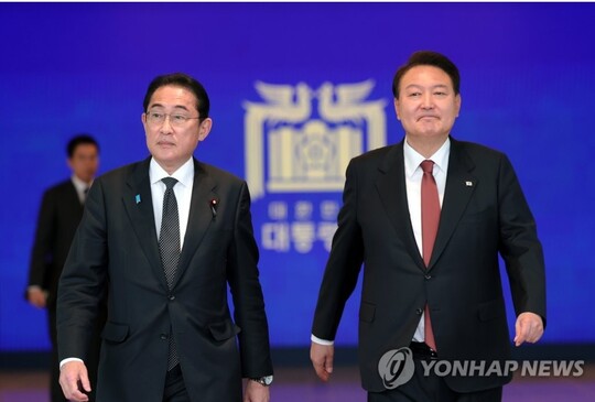 | 윤석열 대통령과 1박2일 일정으로 한국을 찾은 기시다 후미오 일본 총리가 7일 서울 용산 대통령실 청사에서 공동 기자회견을 마친 뒤 나란히 걷고 있다. (사진=연합뉴스) |