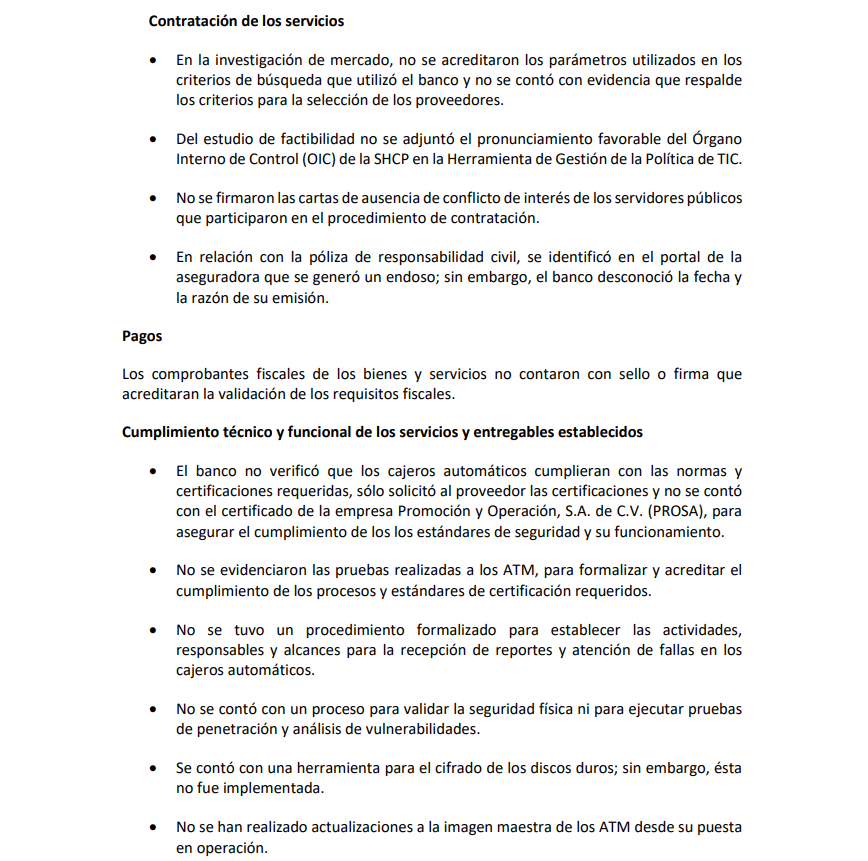 멕시코 연방 상급 감사원(ASF)은 효성솔루션으로부터 ATM기기를 제공받은 방코 델 비에네스타가 세데나에 장비를 설치 공급하는 과정에서 ▲ATM기기의 안전기준 준수 확인 누락 ▲재고 불일치 ▲납품일 변경 등이 문제가 발생했다고 지적했다.