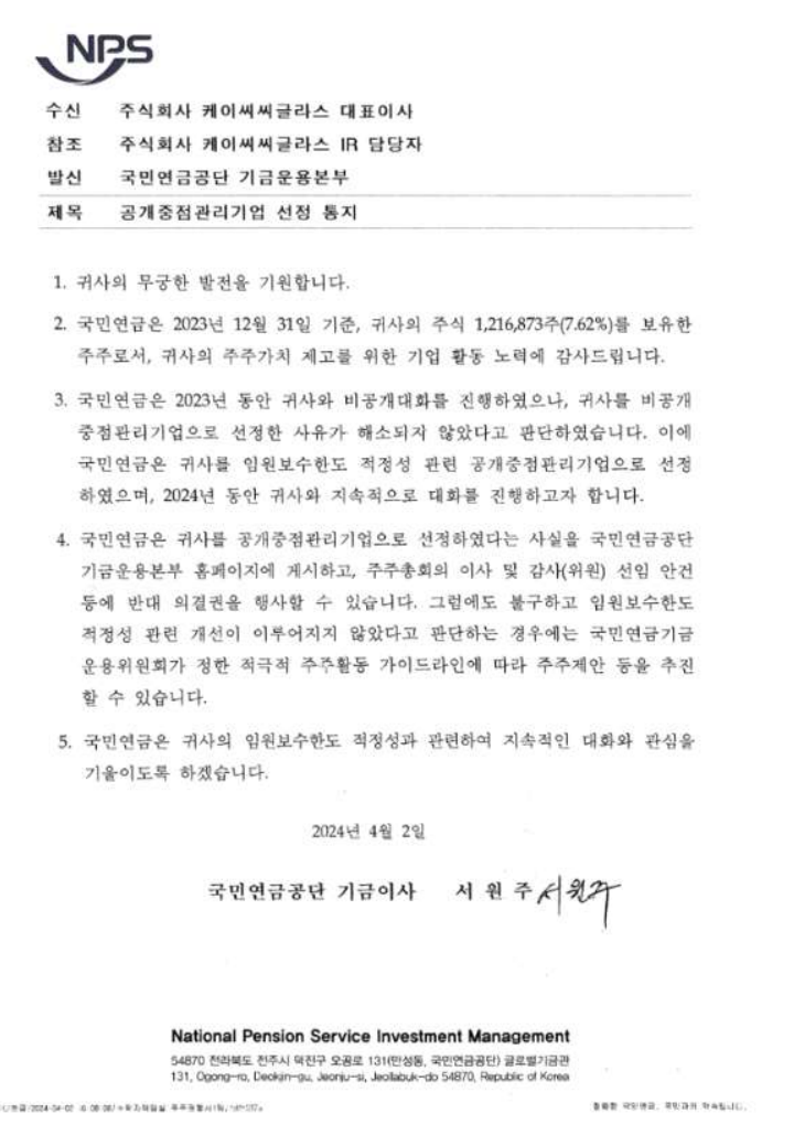 국민연금은 공개서한을 통해 "2023년 동안 비공개대화를 진행했으나, 비공개 중점관리 기업으로 선정한 사유가 해소되지 않았다"며 "이에 KCC글라스를 임원보수한도 적정성과 관련해 공개 중점관리기업으로 선정했다"고 밝혔다.