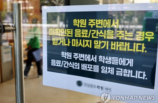 | 9일 서울 대치동의 한 학원에 ‘마약음료’ 관련 안내문이 붙어 있다. (사진=연합뉴스) |