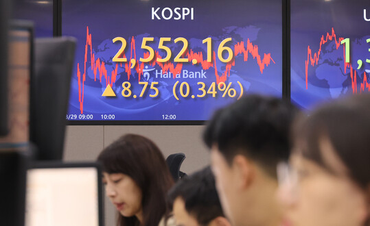 | 29일 서울 명동 하나은행 본점에서 직원들이 증시 및 환율을 모니터하고 있다. 이날 코스피는 전장보다 8.75포인트(0.34%) 오른 2,552.16에 종가를 형성했다. (사진=연합뉴스) |