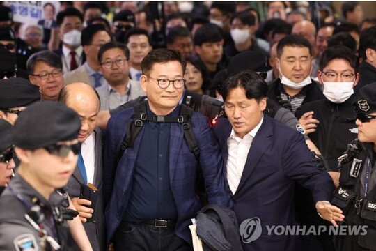| 송영길 전 더불어민주당 대표가 24일 오후 인천국제공항 제1여객터미널을 통해 귀국해 출국장을 나서고 있다. (사진=연합뉴스) |