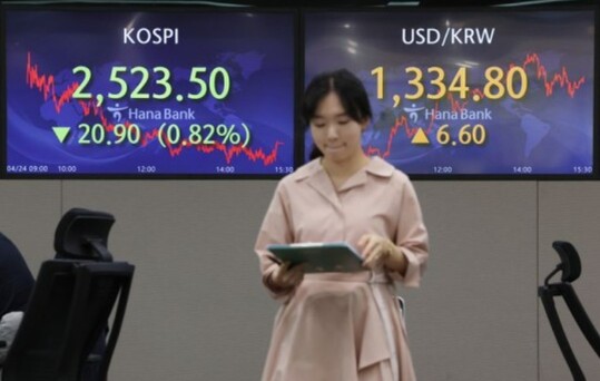| 24일 오후 서울 중구 하나은행 본점 딜링룸에 코스피 지수가 떠 있다. (사진=연합뉴스) |