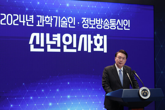 | 윤석열 대통령이 5일 서울 성북구 한국과학기술연구원(KIST)에서 열린 2024년 과학기술인·정보방송통신인 신년 인사회에서 격려사를 하고 있다. (사진=연합뉴스) |