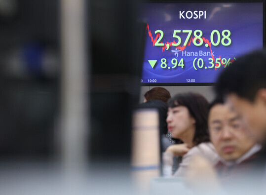 | 코스피가 전장보다 8.94포인트(0.35%) 내린 2578.08로 마감한 5일 오후 서울 중구 하나은행 딜링룸 현황판에 코스피 지수, 원달러 환율 등이 표시돼있다. (사진=연합뉴스) |
