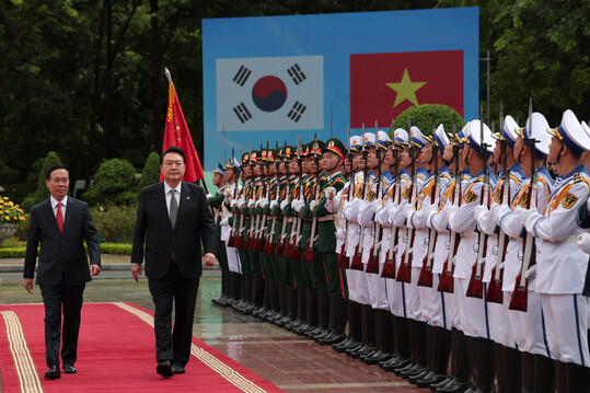 | 베트남을 국빈 방문 중인 윤석열 대통령과 보 반 트엉 베트남 국가주석이 23일(현지시간) 하노이 주석궁 대정원에서 열린 공식환영식에서 의장대를 사열하고 있다. (사진=연합뉴스) |