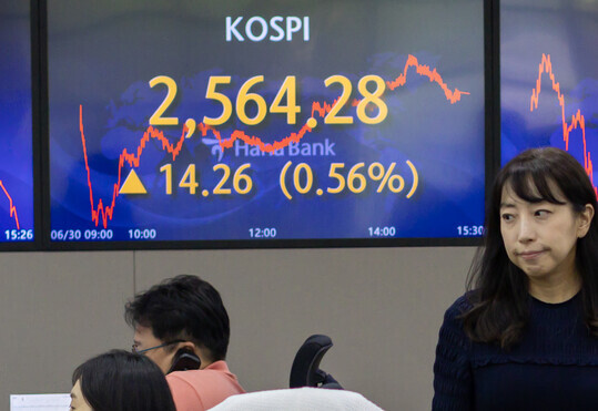 | 30일 오후 서울 중구 하나은행 딜링룸에서 딜러들이 업무를 보고 있다. 이날 코스피는 전날보다 약 0.56% 상승해 2,564.28에 거래를 마쳤다. (사진=연합뉴스) |