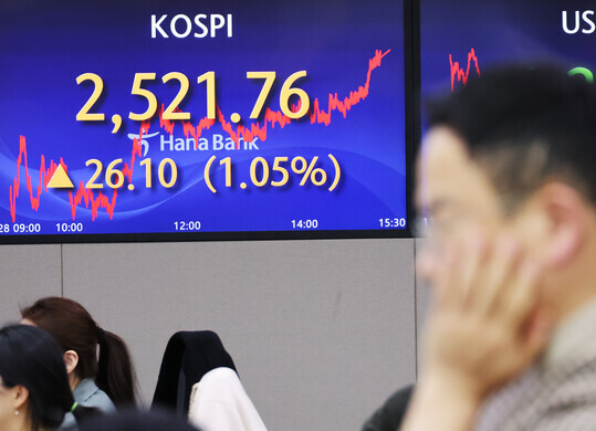 | 코스피가 전장보다 1% 넘게 상승해 2,520대로 올라선 28일 서울 명동 하나은행 딜링룸에서 직원들이 증시 및 환율을 모니터 하고 있다. 이날 코스피 종가는 전장보다 26.10포인트(1.05%) 오른 2,521.76으로 집계됐다. (사진=연합뉴스) |