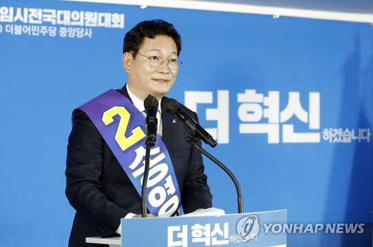 | 2021년 5월 2일 전당대회에서 당대표로 선출된 송영길 의원이 서울 여의도 당사에서 수락 연설을 하는 모습. (사진=연합뉴스 자료사진) |